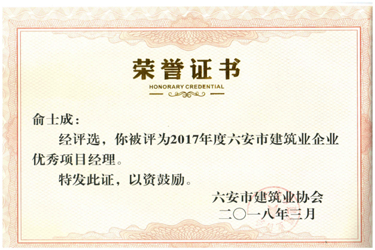 公司榮獲2017年度六安市優(yōu)秀建筑業(yè)企業(yè)、公司項(xiàng)目經(jīng)理俞士成榮獲2017年度六安市建筑業(yè)企業(yè)優(yōu)秀項(xiàng)目經(jīng)理稱號(hào)