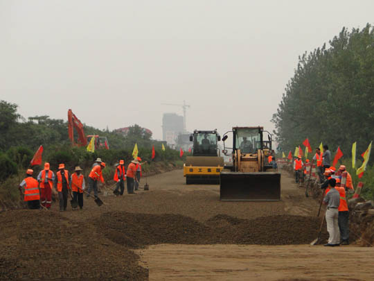 為迎接2012年11月10日在金太陽國際會展中心開幕的第三屆中國國際羽絨節(jié),六安市交通公路實(shí)業(yè)有限公司臨危受命承建G312六安段(金橋西至皖西大道)改建工程延伸段。該工程起于K565+330皖西大道大交叉口處,終點(diǎn)位于K567+200迎賓大道交叉口處,全長1870米,老路為雙向四車道一級公路,路基寬24米,采用下挖反填法,碎石化路面。公司上下克服資金緊、工期短、施工難度大等困難,放棄假日休息,全力以赴,日夜奮戰(zhàn),確保按時(shí)、按質(zhì)、按量完成該工程。目前1.1公里換板修補(bǔ)和面層碎石化已結(jié)束,700米挖方段的級配碎石回填已完成,正在進(jìn)行水穩(wěn)攤鋪,預(yù)計(jì)10月25日完成主體工程。為六安的招商引資創(chuàng)造良好交通環(huán)境,為展示“五色、精彩”六安形象添彩。